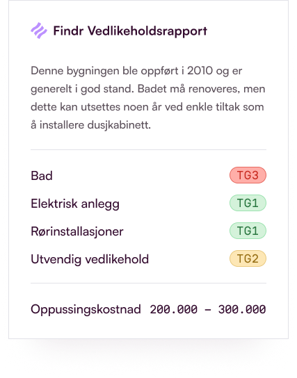 Vurder boligens faktiske tilstand og tekniske installasjoner. Få et lett tilgjengelig estimat på hva oppussing vil koste.